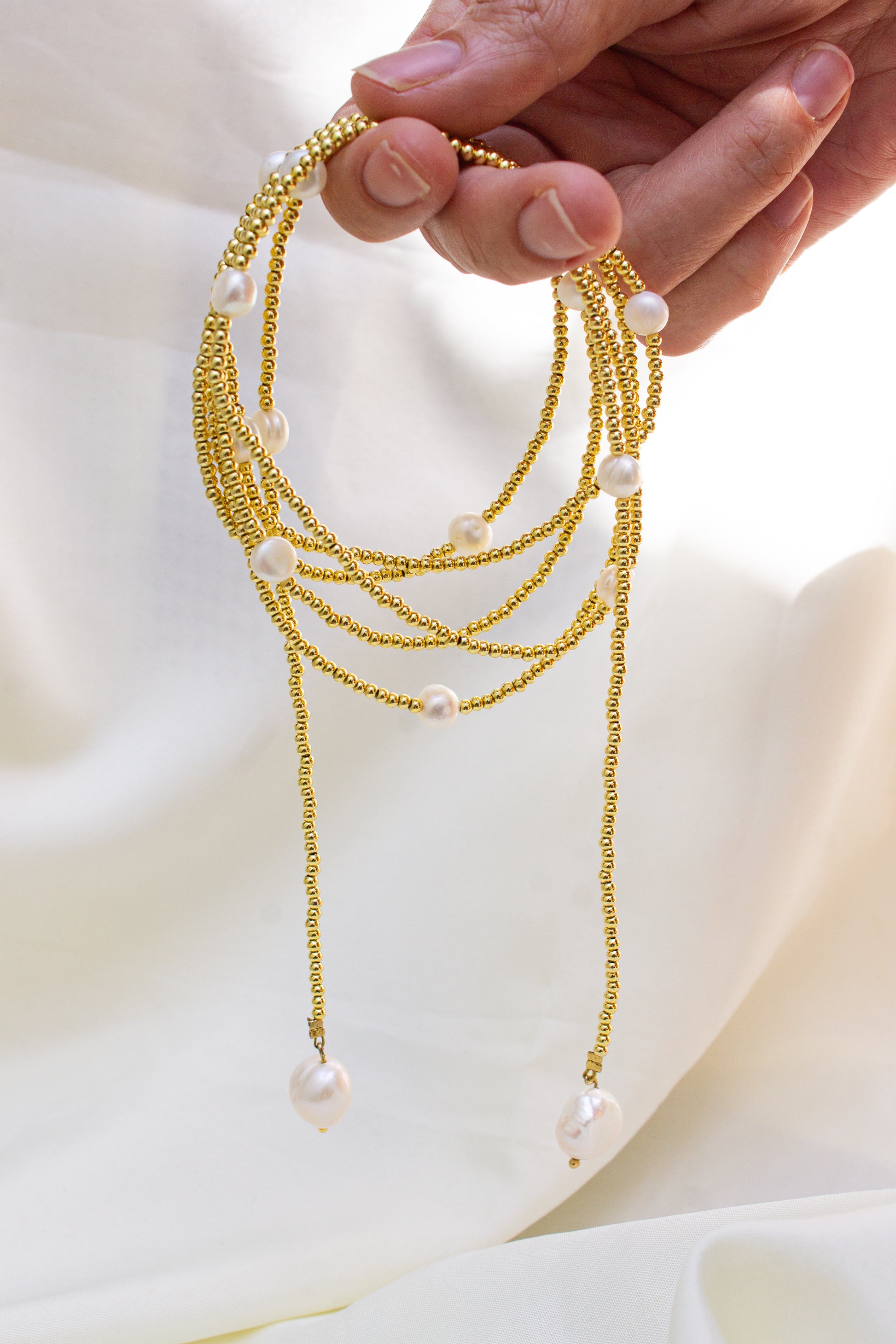 Materiales: baño de oro, perla cultivada. Medidas: 152 cm.