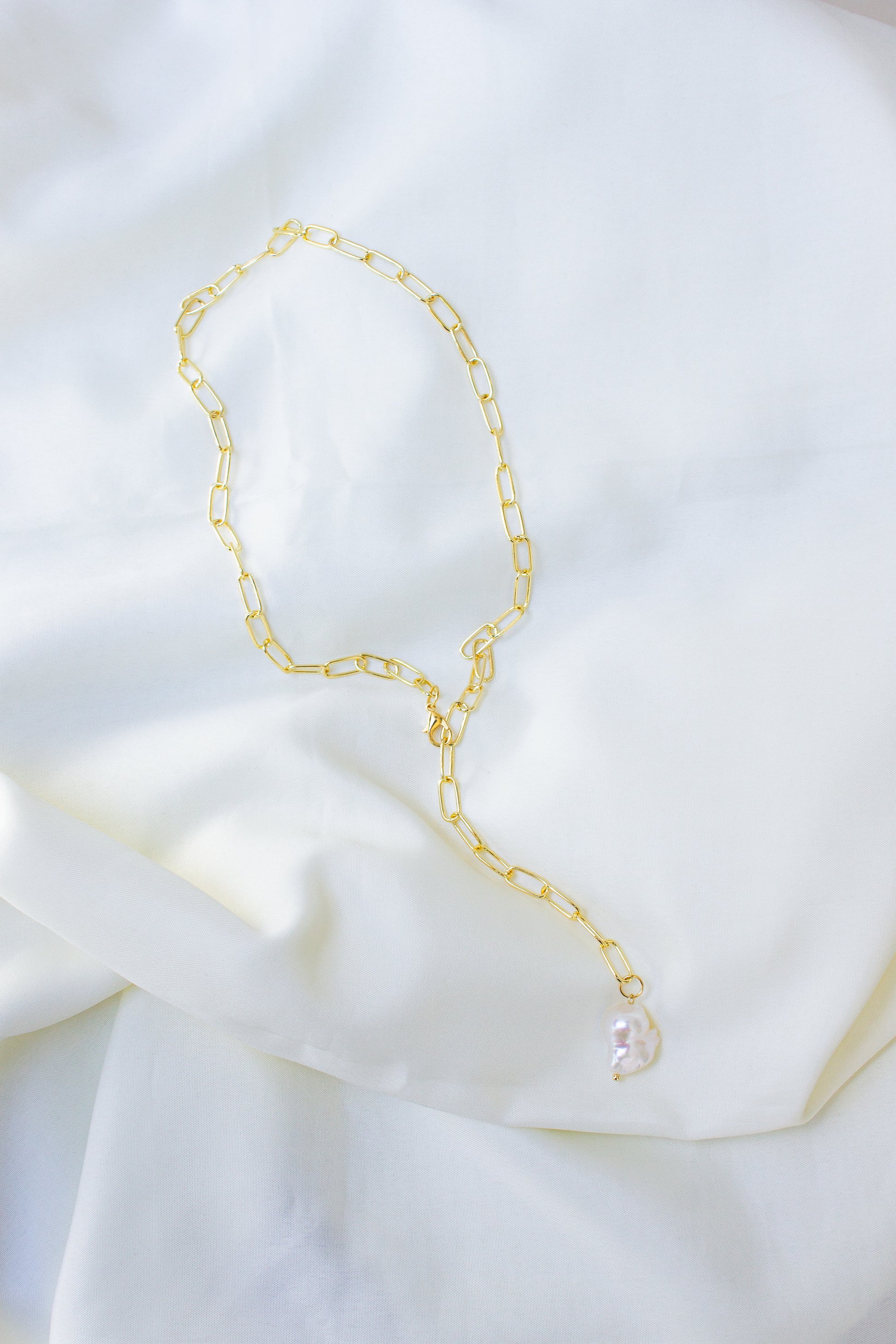 Material: dorado baño de oro, plateado acero inoxidable, perla cultivada. Medida: 54 cm.