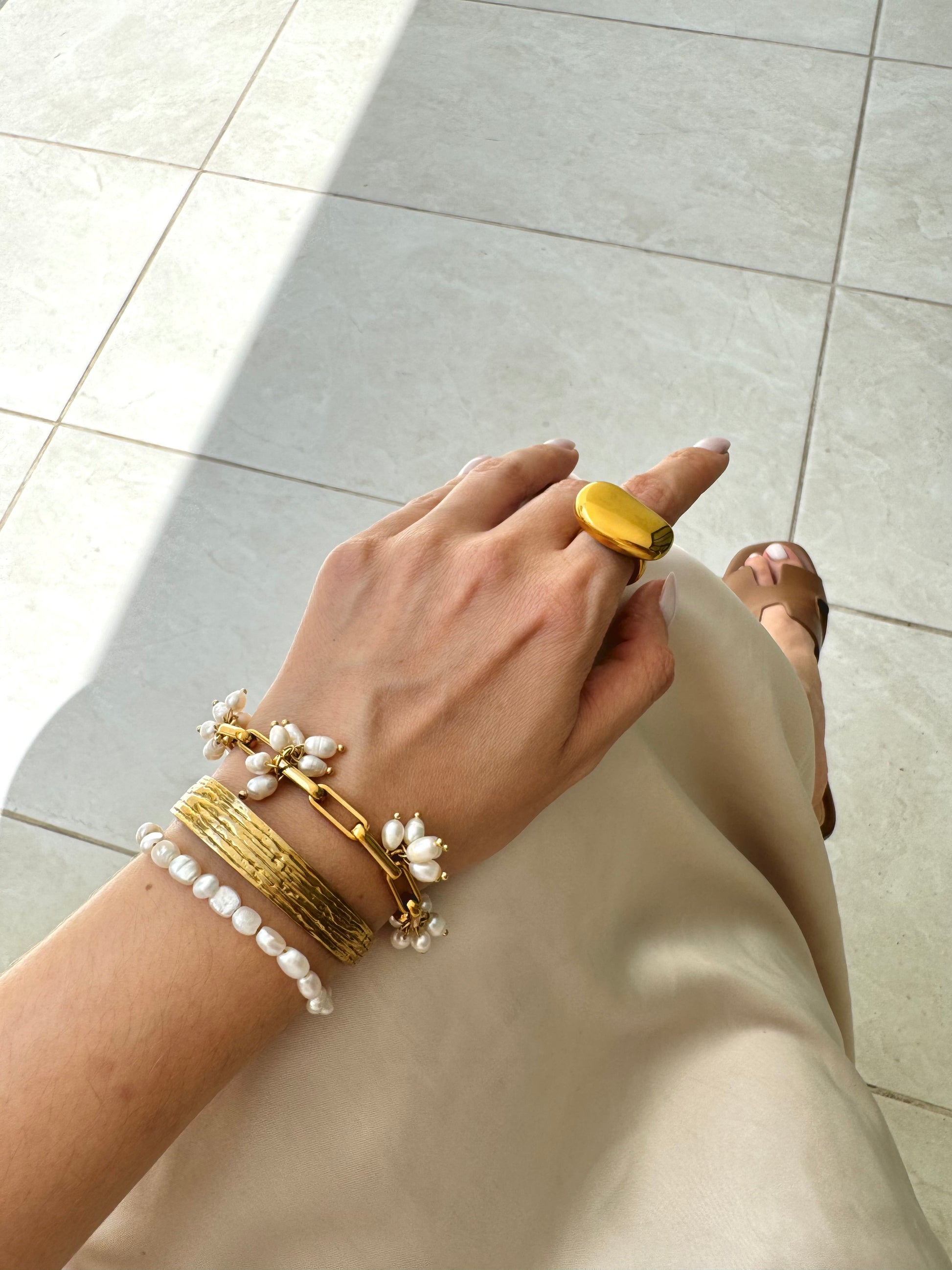 Medidas: 15 cm + 5.5 cm de extensión. Material: acero inoxidable, perlas cultivadas.
