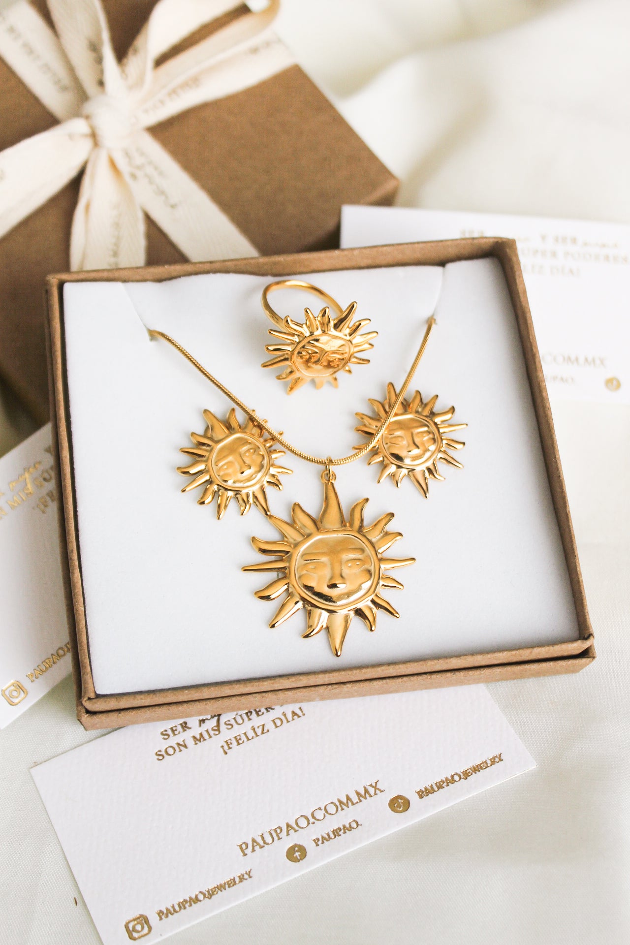 Medida: collar de 45 cm de largo + 7 cm de extensión, aretes de 2 cm de largo, 1 cm de ancho, anillo ajustable. Material: acero inoxidable.